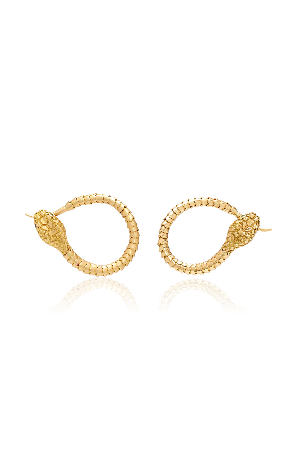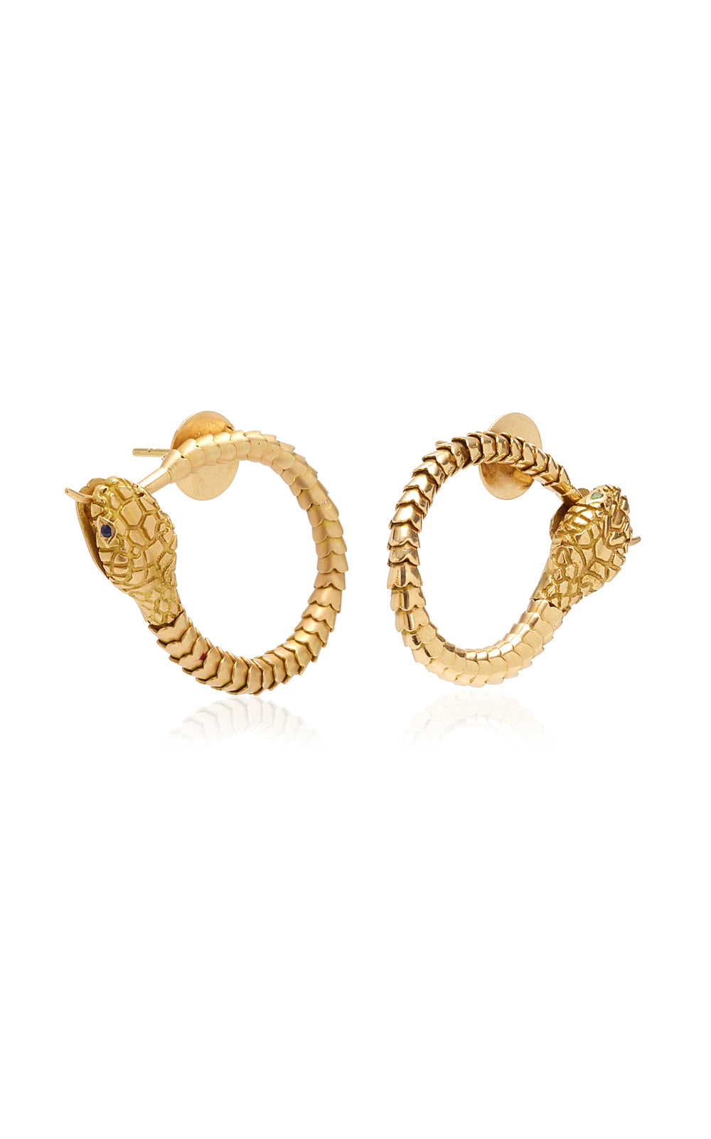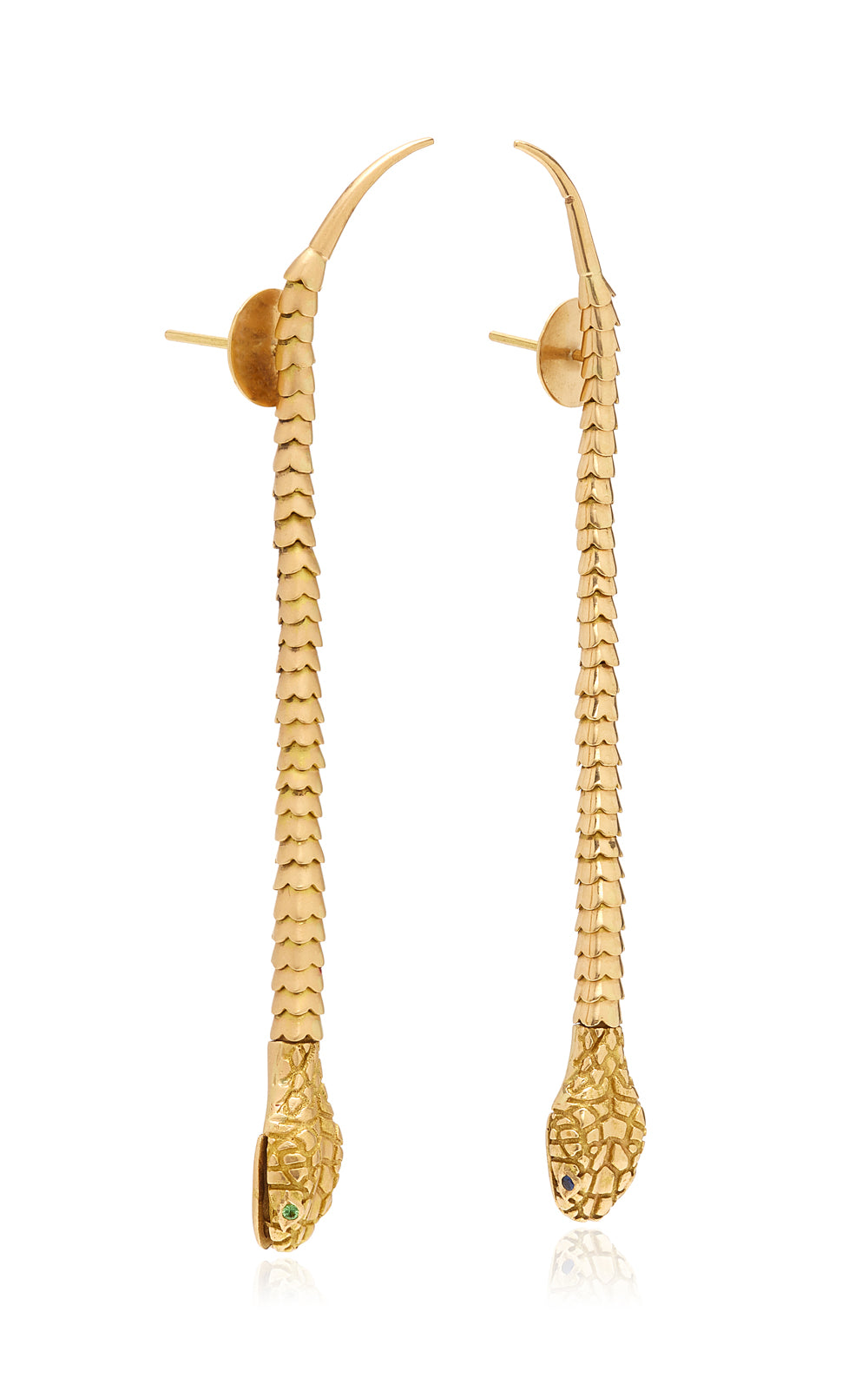 HANDMADE ARTICULATED 18KT GOLD SNAKE EARRINGS WITH GREEN TSAVORITE EYES AND BLUE SAPPHIRES EARRINGS, CAN BE WORN LONG OR HOOKED UP AS HOOPS/AS THE OUROBOROS